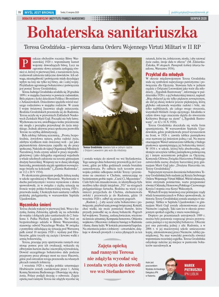 - Bohaterska Sanitariuszka. Teresa Grodzińska – pierwsza dama Orderu Wojennego Virtuti Militari w II RP – Marek Pietruszka, Wydział Archiwalny Delegatury IPN Radom.