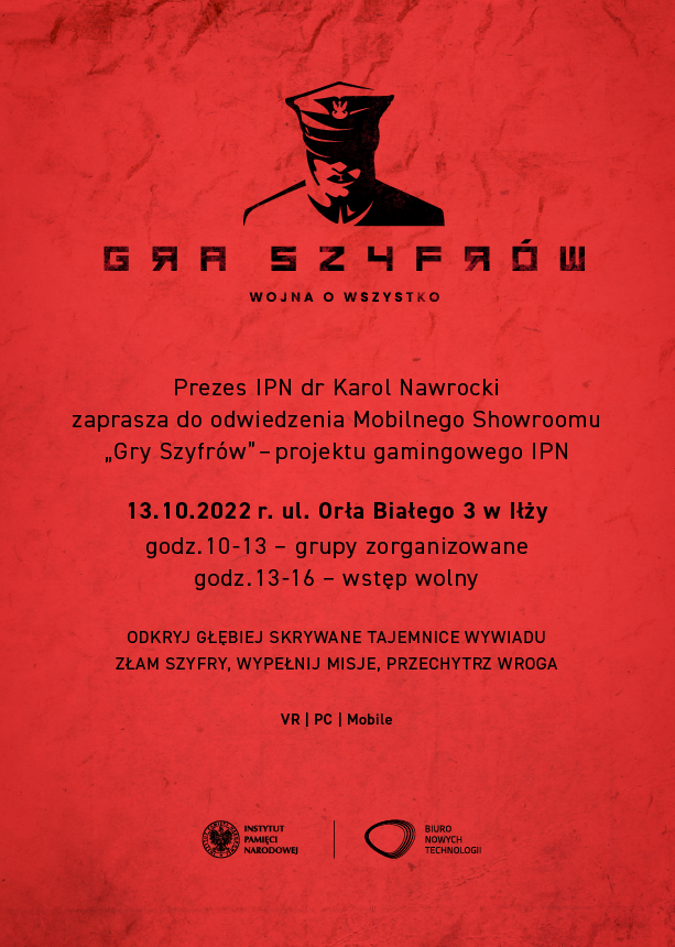 Zapraszamy do odwiedzenia Mobilnego Showroomu promującego gamingowy projekt edukacyjny ,,Gra Szyfrów”. Jest to innowacyjna gra służąca nie tylko rozrywce, ale również edukacji historycznej - przybliżająca grającym realia wojny polsko-bolszewickiej, pracę i dokonania polskich kryptologów. Na wystawie gra dostępna jest na VR oraz PC.