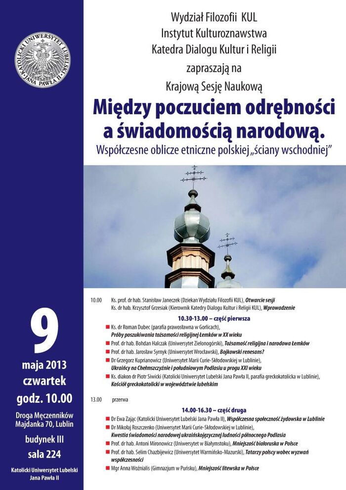 9 maja br. na Katolickim Uniwersytecie Lubelskim odbędzie się Krajowa Sesja Naukowa „Między poczuciem odrębności a świadomością narodową. Współczesne oblicze etniczne polskiej »ściany wschodniej«”. Jej organizatorami są: Wydział Filozofii KUL, Instytut Kulturoznawstwa i Katedra Dialogu Kultur i Religii.