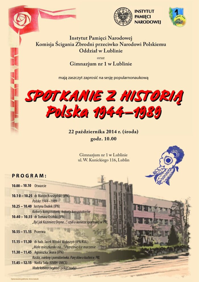 22 października 2014 r. w Gimnazjum nr 1 w Lublinie odbyła się sesja popularnonaukowa „Spotkanie z historią. Polska 1944–1989". W programie znalazły się wykłady na temat Polski lat 1944–1989 (dr Marcin Kruszyński, IPN), kobiet konspiratorek (Justyna Dudek, IPN), sportu w PRL (dr Tomasz Osiński, IPN), warunków mieszkaniowych w wielkiej płycie (dr hab. Jacek Witold Wołoszyn, IPN/KUL) oraz kuchni PRL (Agnieszka Skura, IPN). Spotkanie zakończył pokaz mody kobiecej od lat 40. do końca lat 80., przygotowany przez Nadię Solę ze Studenckiego Koła Naukowego Rekonstrukcji Historycznej UMCS.