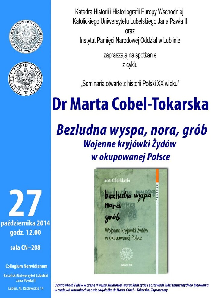 Wraz z początkiem nowego roku akademickiego IPN Oddział w Lublinie wznowił cykl wykładów „Seminaria otwarte z historii Polski XX wieku". Gościem pierwszego spotkania w Collegium Norwidianum  była socjolog dr Marta Cobel-Tokarska, autorka książki „Bezludna wyspa, nora, grób. Wojenne kryjówki Żydów w okupowanej Polsce". Spotkanie poprowadził dr Adam Puławski z lubelskiego oddziału IPN.