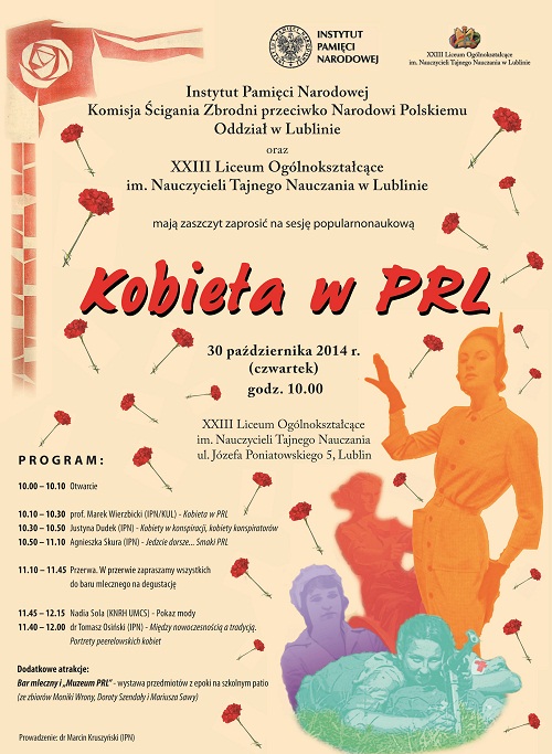 30 października br. w XXIII Liceum Ogólnokształcącym im. Nauczycieli Tajnego Nauczania w Lublinie odbyła się sesja popularnonaukowa „Kobieta w PRL". Wśród atrakcji – oprócz licznych wykładów – znalazły się także: poczęstunek pierogami i kompotem w Barze Mlecznym, pokaz mody oraz wystawa przedmiotów z epoki – a wszystko to złożyło się na ogromny sukces frekwencyjny.