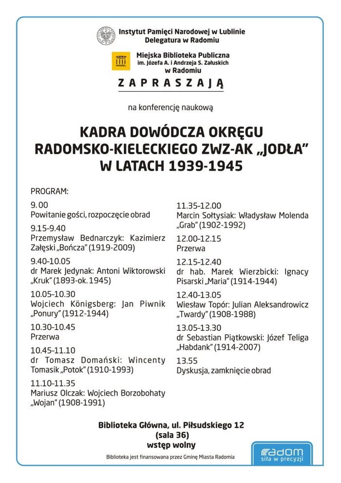 Radomska Delegatura IPN i Miejska Biblioteka Publiczna w Radomiu zapraszają na konferencję naukową „Kadra dowódcza Okręgu Radomsko-Kieleckiego ZWZ-AK »Jodła« 1939–1945", która odbędzie się 4 listopada br. (wtorek), o godz. 9.00, w siedzibie Miejskiej Biblioteki Publicznej w Radomiu przy ul. Piłsudskiego 12.