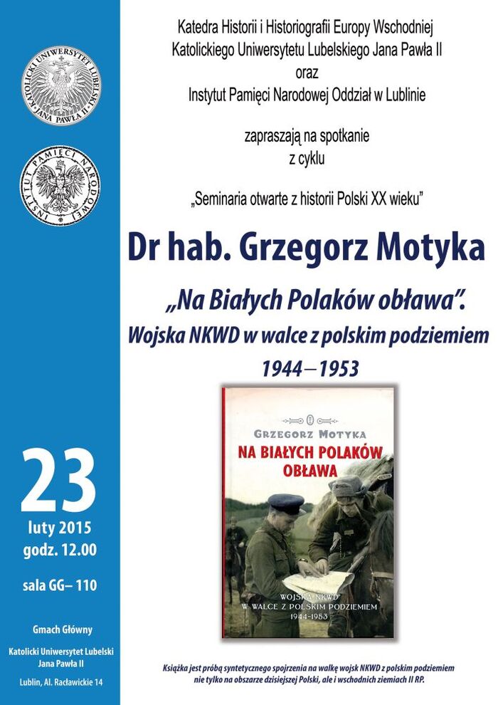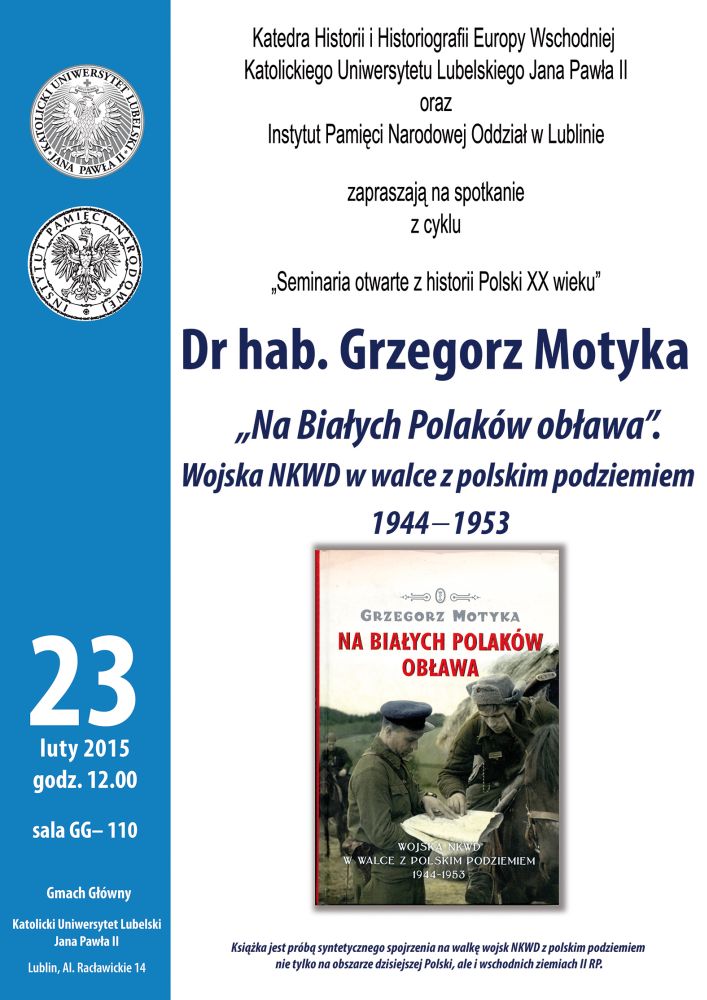 Instytut Pamięci Narodowej Oddział w Lublinie oraz Katedra Historii i Historiografii Europy Wschodniej Katolickiego Uniwersytetu Lubelskiego Jana Pawła II zapraszają na drugie w 2015 roku spotkanie w ramach cyklu wykładów „Seminaria otwarte z historii Polski XX wieku”. Odbędzie się ono 23 lutego (poniedziałek) o godz. 12.00 w sali GG-110 w Gmachu Głównym Katolickiego Uniwersytetu Lubelskiego Jana Pawła II, przy al. Racławickich 14 w Lublinie.