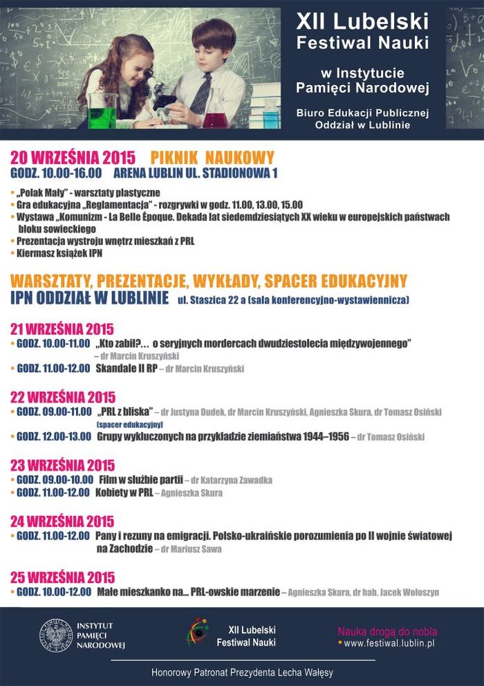 - zapraszamy na Piknik Naukowy (godz. 10.00–16.00, Arena Lublin, ul. Stadionowa 1), podczas którego odbędą się warsztaty plastyczne dla najmłodszych „Polak Mały”, rozgrywki najnowszej gry edukacyjnej „Reglamentacja” (godz. 11.00, 13.00, 15.00), prezentacja wystroju wnętrz mieszkań w PRL oraz kiermasz książek IPN.