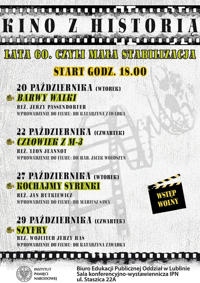 20 października w lubelskim oddziale Instytutu Pamięci Narodowej rusza przegląd filmów „Lata 60., czyli mała stabilizacja”. Tym razem poprzez kino opowiemy o latach 60. ubiegłego wieku: o problemach mieszkaniowych („Człowiek z M-3”) i motoryzacyjnych marzeniach Polaków („Kochajmy syrenki”). Pretekstem do opowieści o życiu politycznym będą „Barwy walki” oparte na książce Mieczysława Moczara, zaś ciągle wówczas żywą pamięć o II wojnie światowej przybliżą „Szyfry”.
