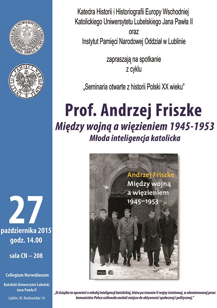 27 października o godz. 14.30 na Katolickim Uniwersytecie Lubelskim odbyło się spotkanie z prof. Andrzejem Friszkem wokół jego najnowszej książki „Między wojną a więzieniem 1945–1953. Młoda inteligencja katolicka”.