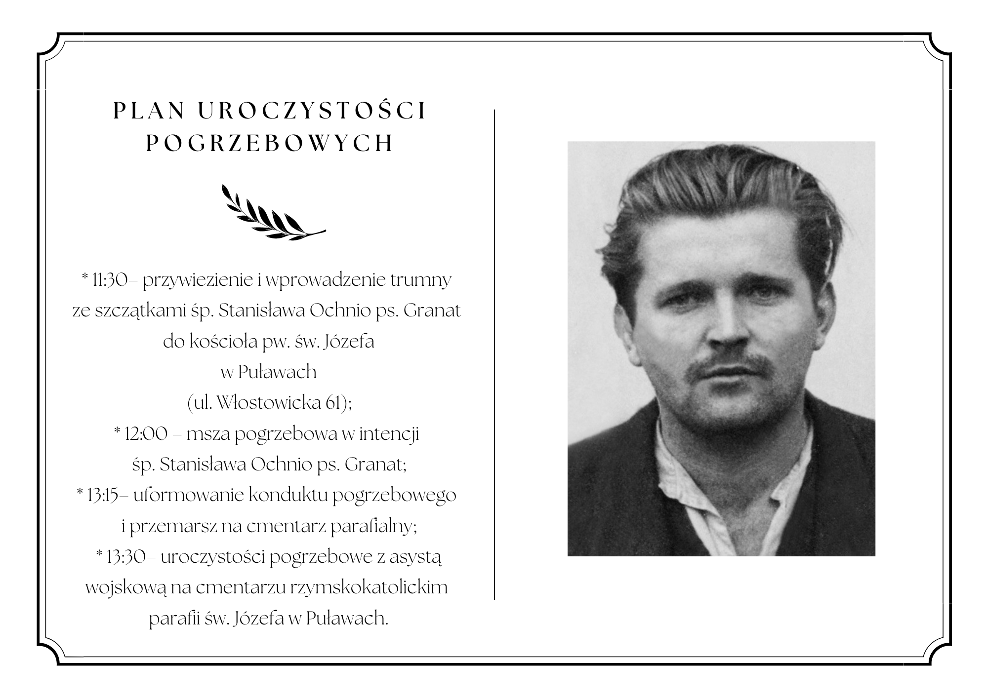 13:30 – Uroczystości pogrzebowe z asystą wojskową i złożenie szczątków do grobu
