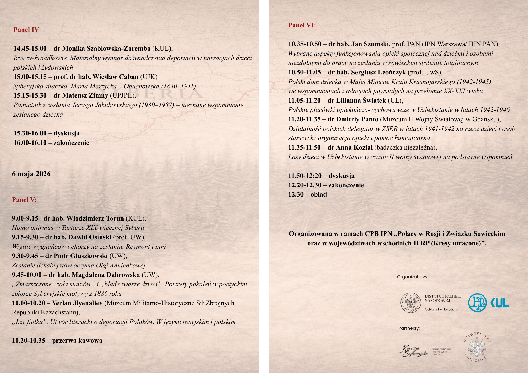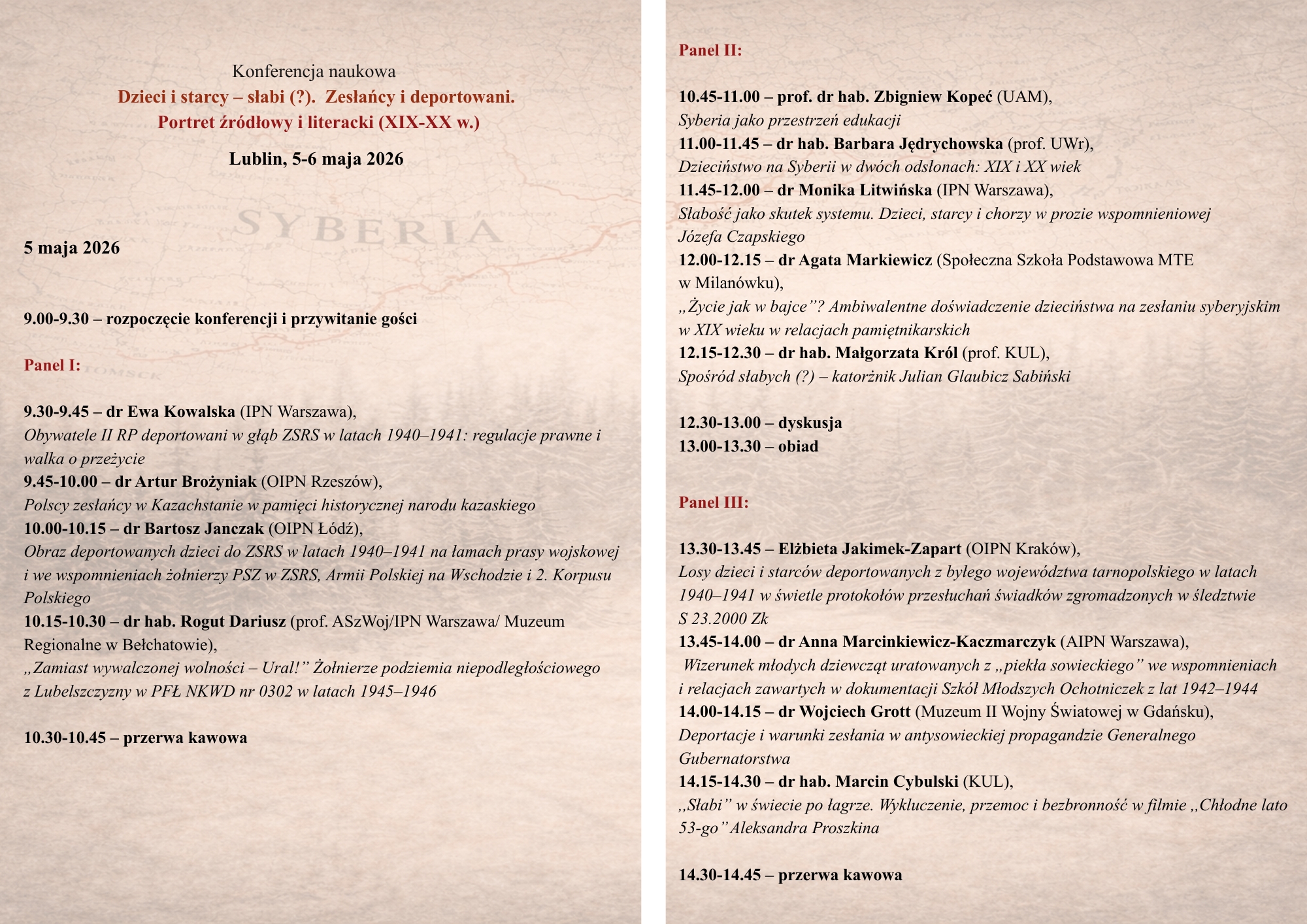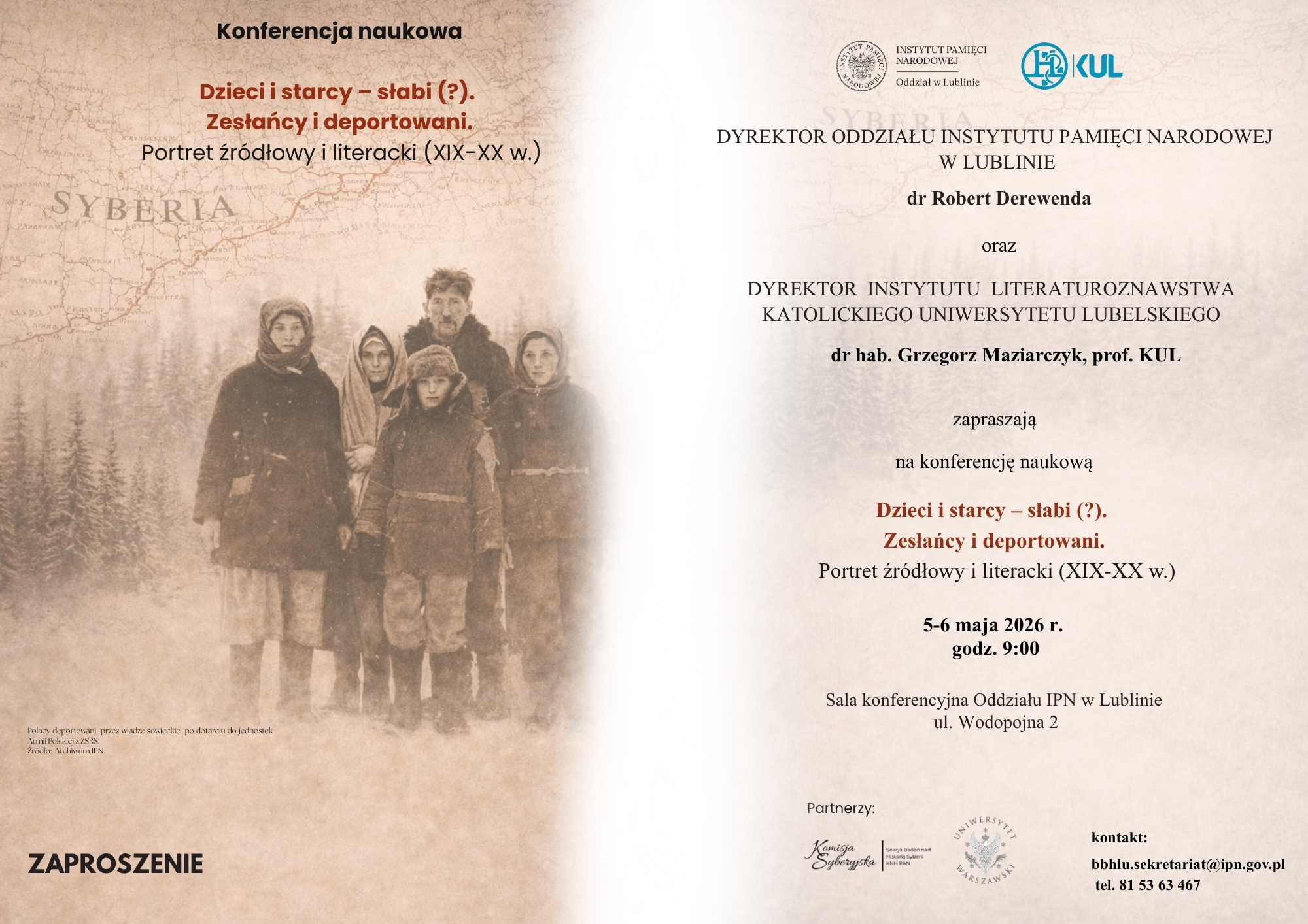 Dyrektor Oddziału Instytutu Pamięci Narodowej w Lublinie – dr Robert Derewenda oraz Dyrektor Instytutu Literaturoznawstwa Katolickiego Uniwersytetu Lubelskiego dr hab. Grzegorz Maziarczyk, prof. KUL zapraszają na konferencję naukową pt. " Dzieci i starcy – słabi (?). Zesłańcy i deportowani. Portret źródłowy i literacki (XIX-XX w.)". Uczestnicy konferencji podejmą interdyscyplinarną refleksję nad losem szeroko pojmowanych „najsłabszych” – dzieci, ludzi starych, chorych i wykluczonych – w realiach zesłań na Wschód, ze szczególnym uwzględnieniem doświadczeń przemocy systemowej, marginalizacji oraz strategii przetrwania. Planowane sympozjum będzie okazją do interdyscyplinarnego namysłu nad źródłami historycznymi, świadectwami pamiętnikarskimi, literaturą oraz sztuką, które dokumentują i interpretują te niezwykle dramatyczne karty w dziejach narodu polskiego.