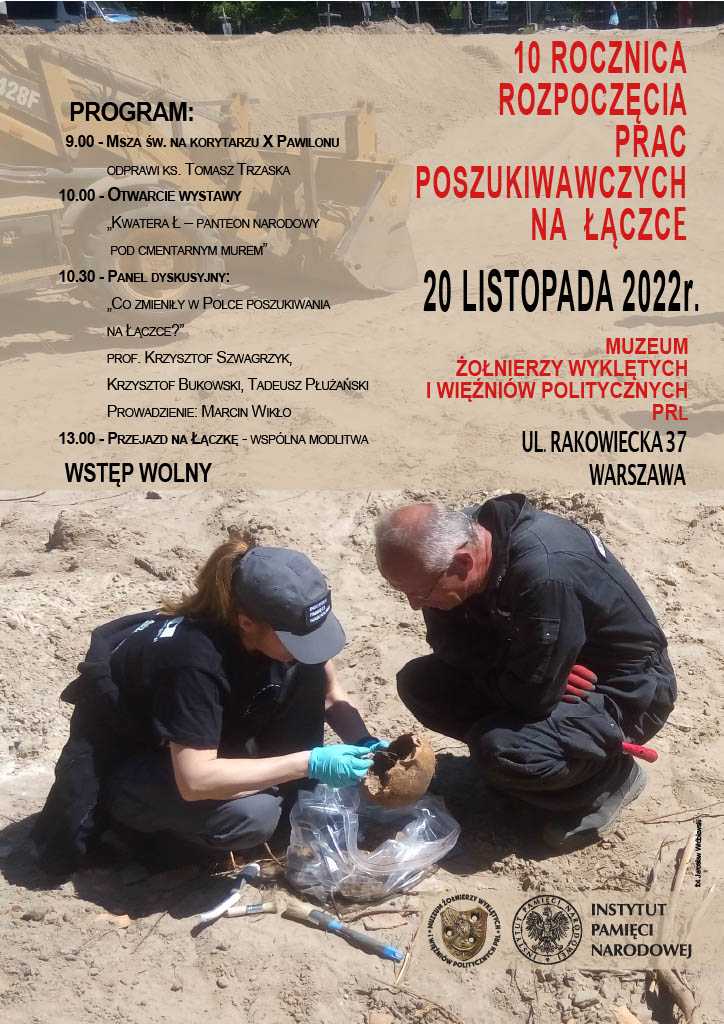 – Łączka to miejsce szczególne w polskiej historii. Tutaj potajemnie zakopywano ciała żołnierzy, których strzałem katyńskim mordowano po wojnie w więzieniu na Rakowieckiej. Łączka na Cmentarzu na Powązkach Wojskowych to symbol krzywdy wobec polskiego narodu, bólu, ale i po latach poszukiwań – symbol zwycięstwa i powrotu po swoich bohaterów. Każdy, kto poznał to miejsce, wie, że nie można go zapomnieć, że jest to dla Polaków miejsce święte. Cieszę się, że w muzeum na Rakowieckiej będziemy o tych wydarzeniach opowiadać i modlić się za ofiary i tych, którzy je po latach odnajdywali. Nie byłoby tego spotkania, gdyby nie wysiłek prof. Krzysztofa Szwagrzyka i jego zespołu w Instytucie Pamięci Narodowej, a także wielu wolontariuszy, których serdecznie zapraszam na to spotkanie – mówi dr. hab. Filip Musiał, dyrektor Muzeum Żołnierzy Wyklętych i Więźniów Politycznych PRL w Warszawie.