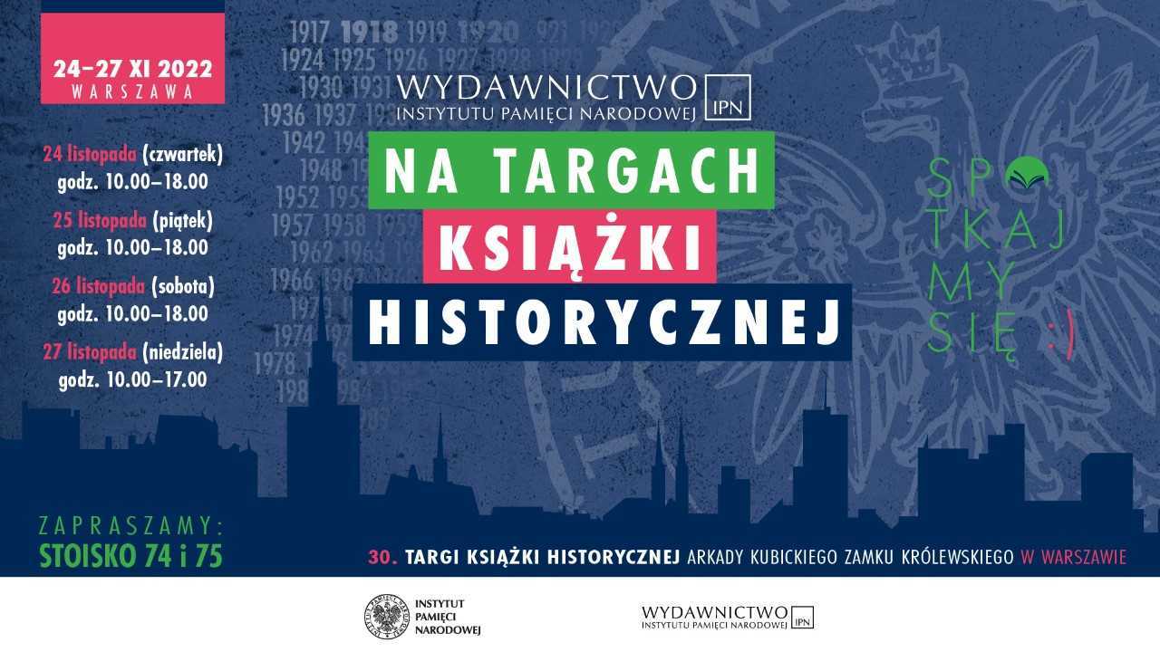 W dniach 24–27 listopada 2022 r. Arkady Kubickiego w Warszawie będą gościć wydawców z całej Polski w ramach XXX targach książki historycznej. Wśród wystawców nie zabraknie oferty Wydawnictwa Instytutu Pamięci Narodowej. Przygotowaliśmy dla Państwa szereg ciekawych wydarzeń. Na stoisku nr 74 i 75 będziemy gościć 15 autorów naszych książek, będzie to dobra okazja do osobistych spotkań i wymiany myśli.