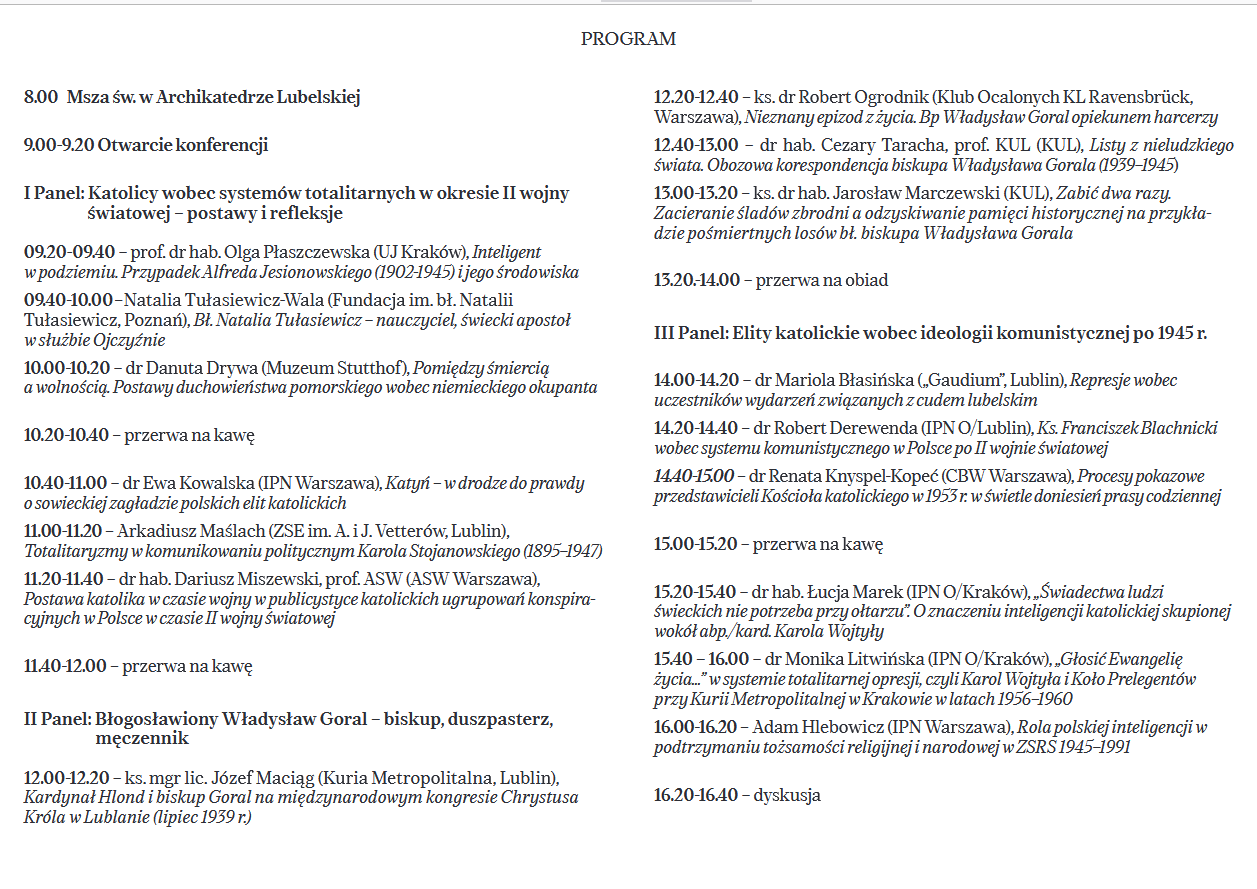 Zapraszamy do udziału w konferencji naukowej pt. Katolickie elity wobec systemów totalitarnych (1939–1989). W 80. rocznicę męczeńskiej śmierci błogosławionego biskupa Władysława Gorala organizowanej przez Oddział Instytutu Pamięci Narodowej w Lublinie oraz Instytut Historii Katolickiego Uniwersytetu Lubelskiego Jana Pawła II. Konferencja odbędzie się 23 kwietnia 2025 r. w sali konferencyjnej IPN w Lublinie przy ul. Wodopojnej 2, a rozpoczęcie konferencji nastąpi o godz. 9.00. O godz. 8.00 sprawowana będzie Msza św. w Archikatedrze Lubelskiej.